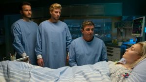 Dr. Martin Gruber (Hans Sigl, 2.v.r.), Markus Jenner (Nicolas Wolf, l.) und Fabian Marx (Hannes Schmid, 2.v.l.) machen sich große Sorgen um den Gesundheitszustand von Karla Jenner (Sarah Mahita, r.).