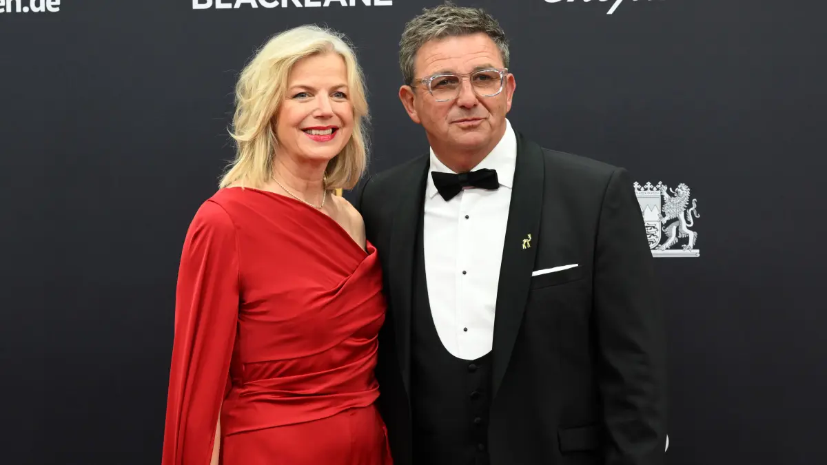 Auf dem ersten Foto ist das Ehepaar gemeinsam zu sehen: Hans Sigl erscheint elegant in schwarzem Anzug, seine Frau Susanne setzt auf einen stilvollen Hosenanzug in Schwarz und Weiß.
