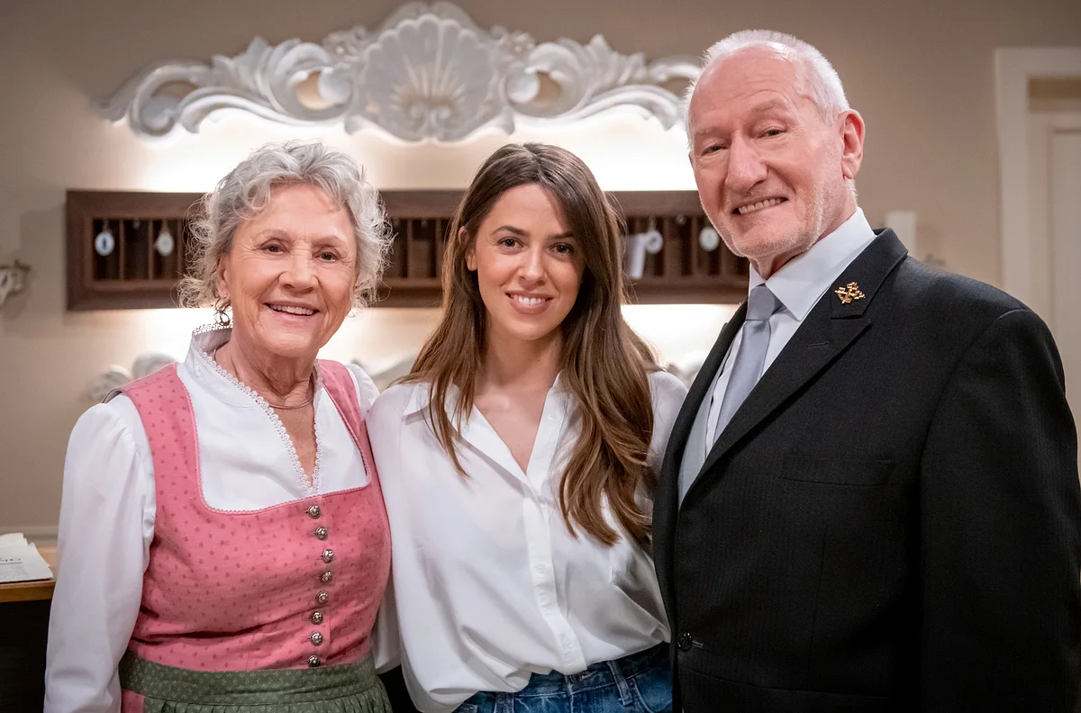 Sängerin Vanessa Mai (Mitte) den den “Sturm der Liebe”-Legenden Antje Hagen und Sepp Schauer. Foto: ARD/Christof Arnold Sängerin Vanessa Mai (31) ist es
