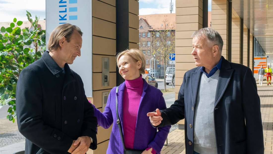 Martin Stein (Bernhard Bettermann, li.), Kathrin Globisch (Andrea Kathrin Loewig) und Roland Heilmann (Thomas Rühmann, re.) stehen gemeinsam vor der Sachsenklinik.